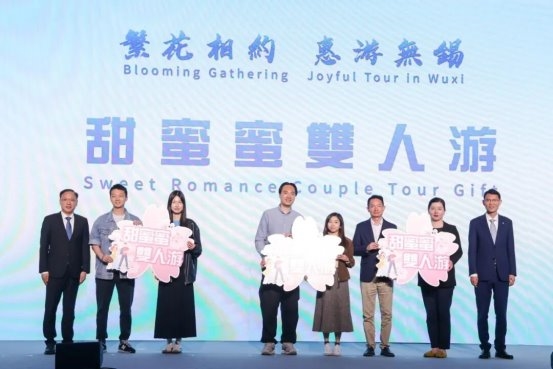 无锡市人民政府秘书长陈寿彬、无锡市文旅集团董事局主席程述为获得“甜蜜蜜双人游”大礼包的市民发放大礼包。