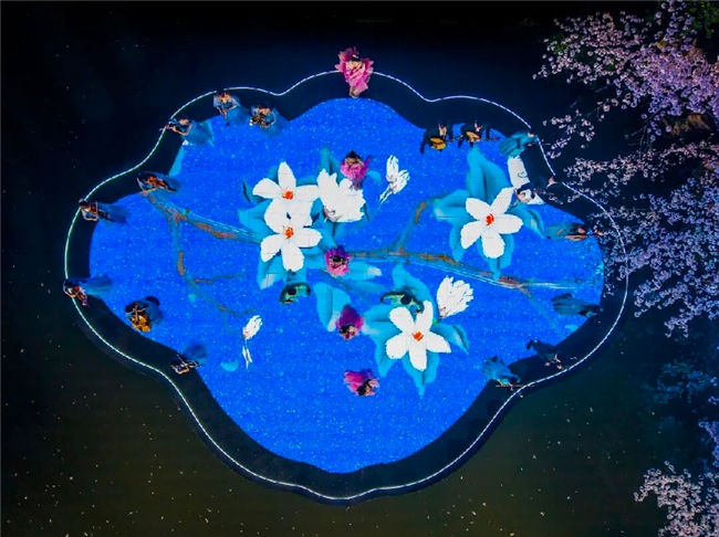 以赏樱楼为核心打造沉浸式夜樱视听体验,大屏光影、环境灯影与人物随身光源三重交织,层次丰富、动静相融,让赏樱者沉浸式置身光影与樱雪交织的春日盛宴。